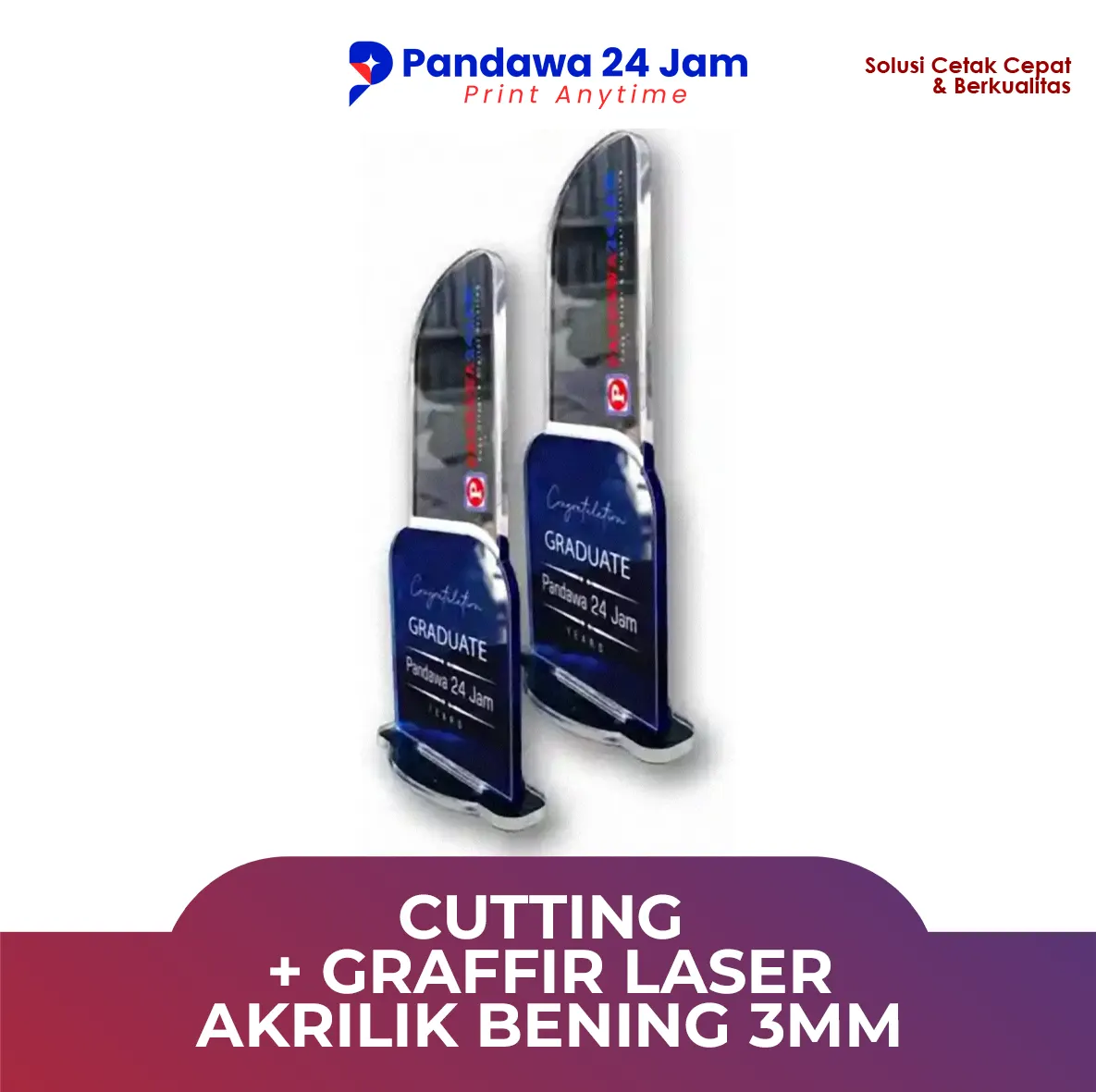 Cutting + Grafir Laser Akrilik: Nikmati keindahan dan keunikan produk akrilik yang dikerjakan dengan teknologi laser. Proses cutting dan grafir laser menghasilkan potongan yang bersih dan presisi, serta detail ukiran yang tajam. Material akrilik yang berkualitas memberikan tampilan yang elegan dan modern.