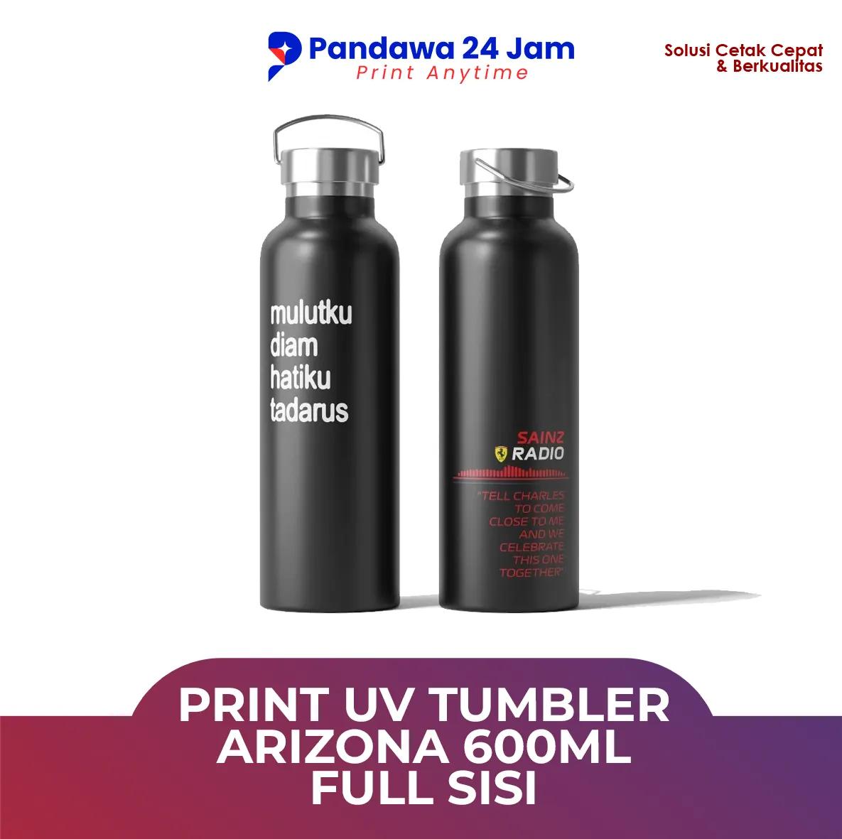 Tumbler Arizona ukuran 600ml dengan teknologi cetak UV Full sisi adalah pilihan sempurna untuk menampilkan kreativitas Anda. Dengan teknik cetak canggih ini, desain Anda akan terlihat tajam, cerah, dan tahan lama.