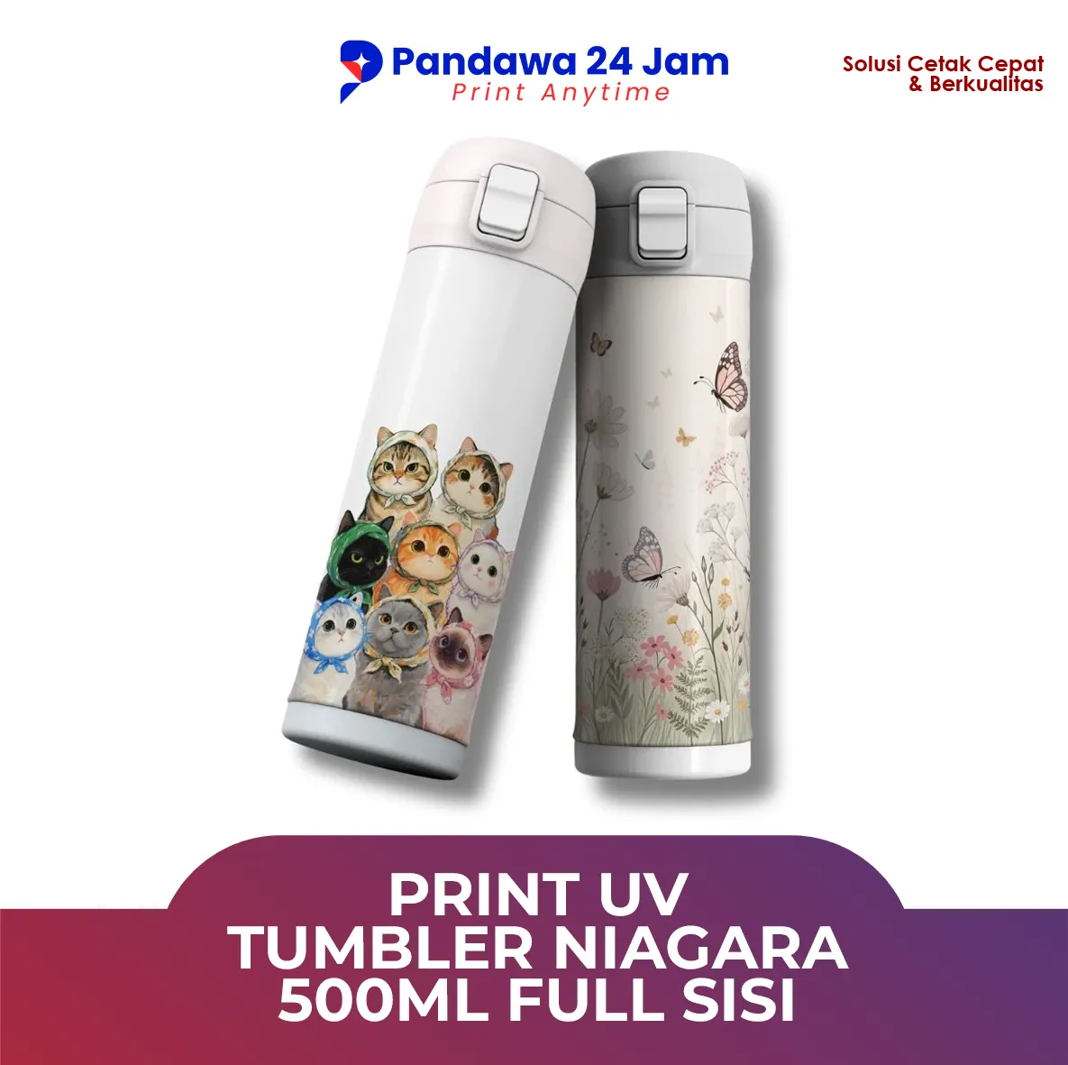 Tumbler Niagara 500ml dengan teknologi cetak UV Full Sisi adalah pilihan sempurna untuk menampilkan kreativitas Anda. Dengan teknik cetak canggih ini, desain Anda akan terlihat tajam, cerah, dan tahan lama.